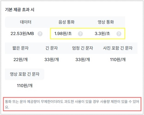 기본 제공 초과 시엔 음성통화는 초당 1.98원이, 영상 통화는 초당 3.3원이 부과된다.