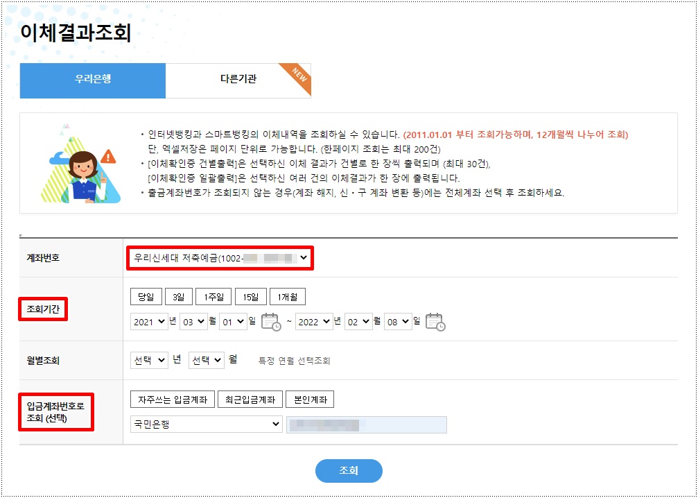 2. 계좌번호 확인, 조회기간(12개월), 임대인 계좌번호 쓰고 조회 누르기.