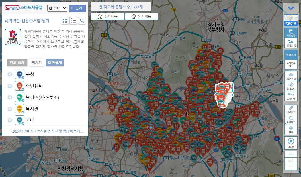 🔽 이렇게 스마트 서울맵으로 폐의약품 전용수거함 위치도 볼 수 있음.