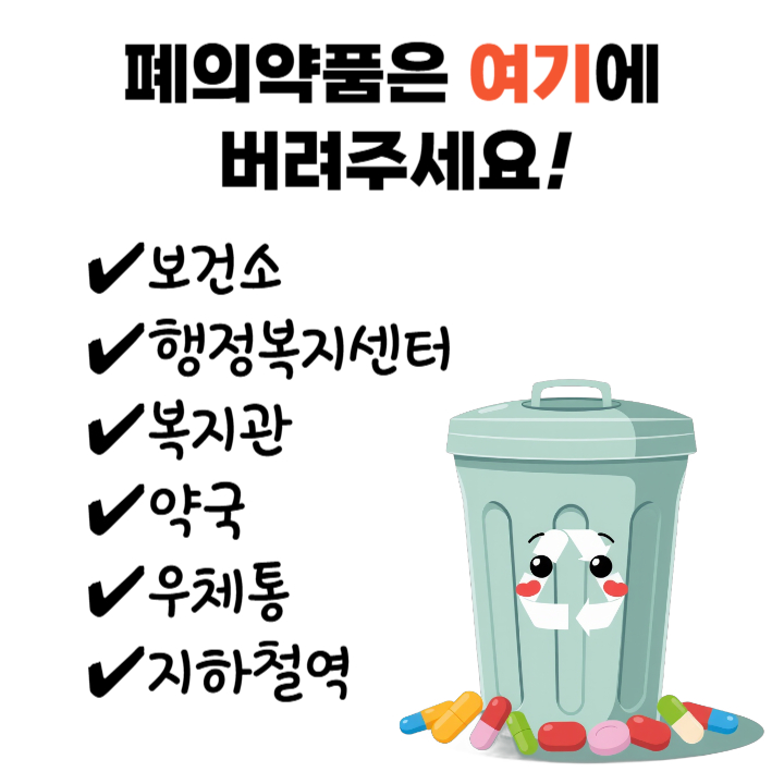 자! 이제 폐의약품을 어떻게 버리는지 알았으니, 앞으로 일반쓰레기나 하수구에 흘려보내는 일은 없어야겠죠?