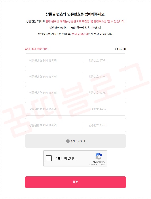 그럼 이런 화면이 뜰 텐데요, 아까 받은 문자의 상품권번호 16자리와 인증번호 4자리를 입력하고 충전 눌러주면 끝입니다.