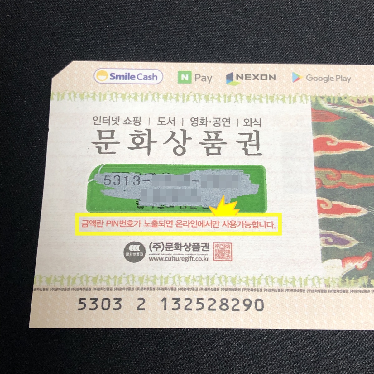 왜 긁었냐 하면.. 금액란 PIN 번호가 노출되면 온라인에서만 사용 가능합니다. 라고 쓰여있었기 때문입니다.