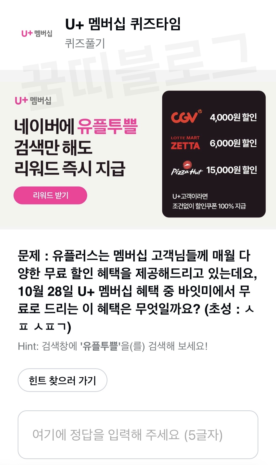 문제 : 유플러스 멤버십 고객님들께 매월 다양한 무료 할인 혜택을 제공해드리고 있는데요, 10월 28일 U+ 멤버십 혜택 중 바잇미에서 무료로 드리는 이 혜택은 무엇일까요?