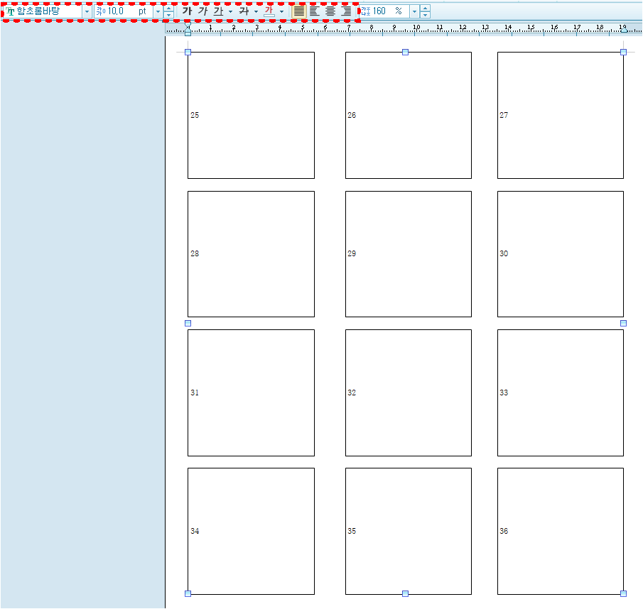 짠-! 정렬은 다 되었고, 글상자 전부 그룹화 해준다음 칸마다 번호를 써줍니다. 이게 좀 번거로웠지만요,