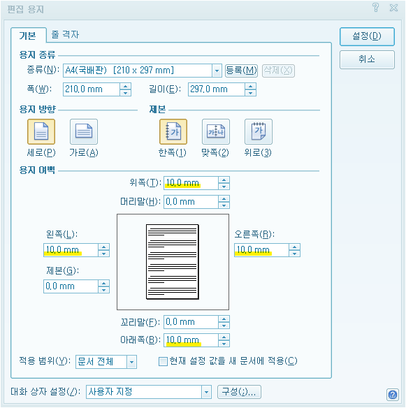 1. 한글을 켜서 F7을 눌러 편집 용지 설정을 해줍니다. 머리말, 꼬리말 제외한 모두 10으로 맞춰줄게요.