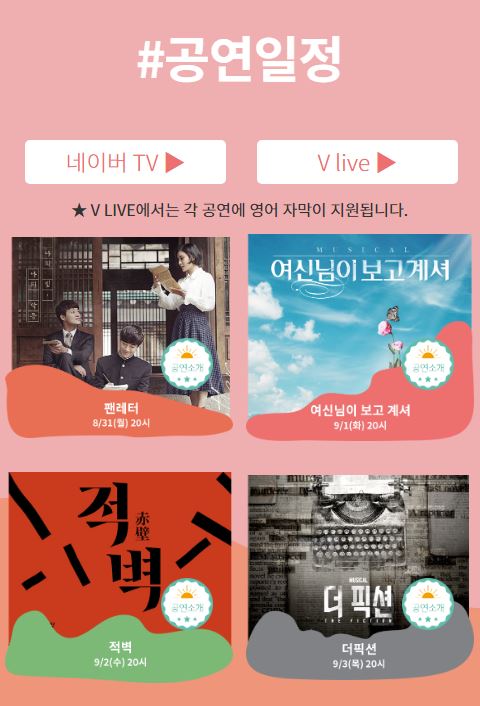 국내 인기 뮤지컬, 팬레터, 여신님이보고계셔, 적벽, 더픽션, 네이버TV에서 실시간으로 즐기실 수 있습니다