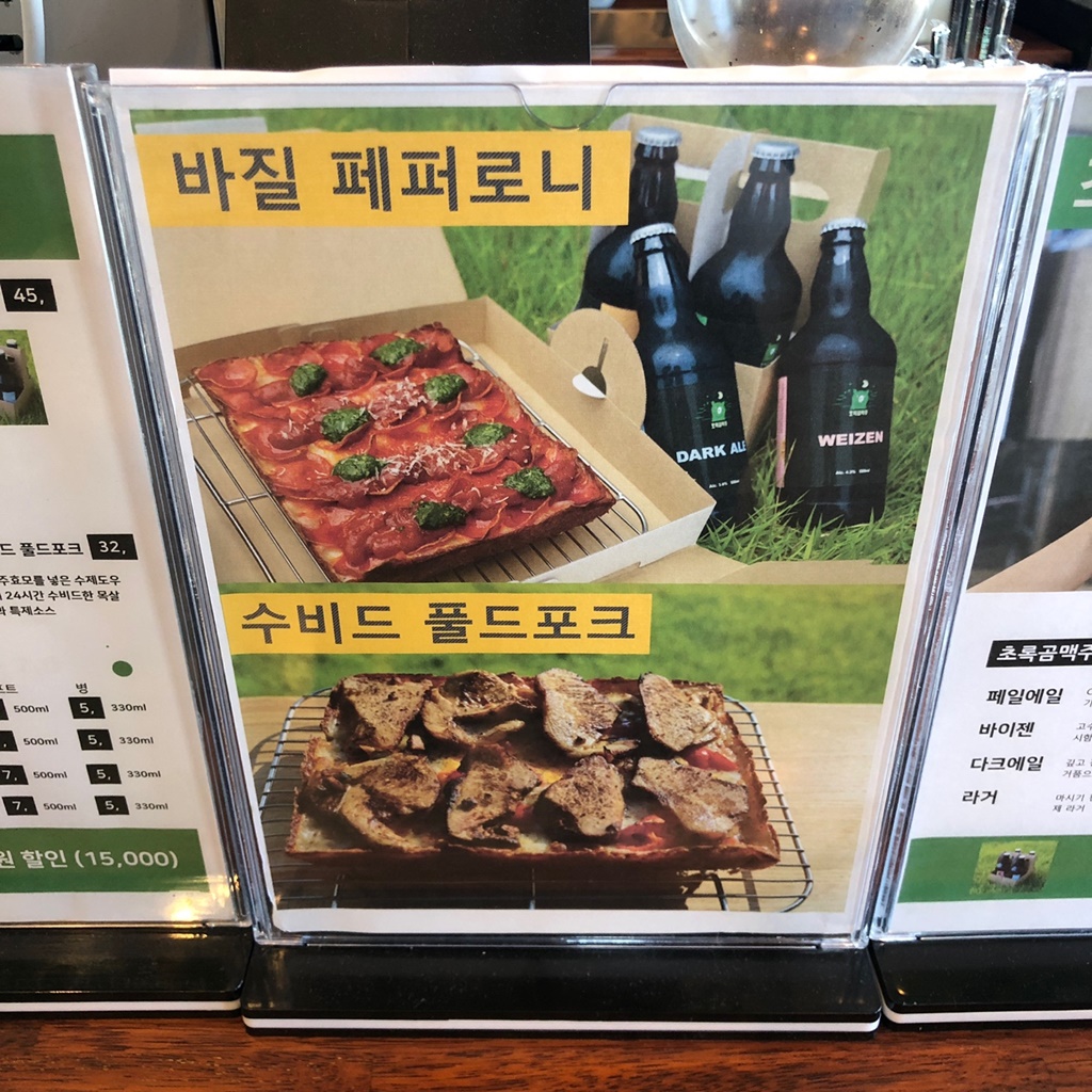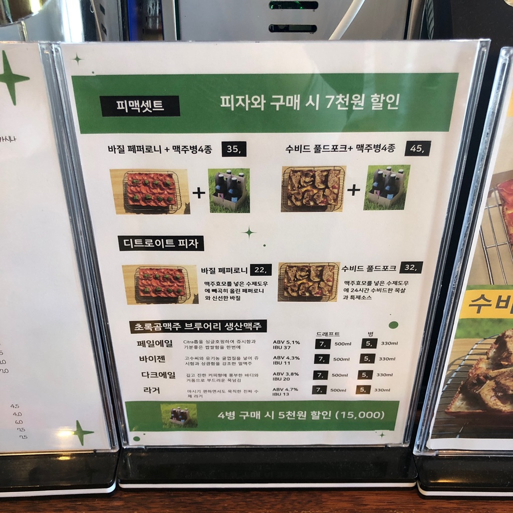 인천 강화도 동막해변 근처 카페 초록곰 커피. 두가지맛 피자와 수제 맥주를 판매하고 있다. 체험단으로 다녀왔는데, 원래 제공되는 것은 피맥이었으나 준비가 되지 않아서 먹지 못했다. 분명 전날 사장님한테 연락(예약)하고 간건데 말이다.. 수비드 풀드포크를 먹어보고 싶었는데.. 그치만 사과도 받았고 다른 디저트와 음료로 대체해서 잘 먹고 왔다. 무엇보다 초록곰이 귀여워서 봐줬다 ㅋ