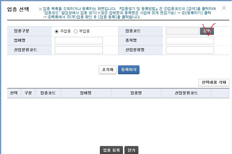 5-2. 이런 팝업이 뜨고, 업종코드 옆에 검색 버튼을 누른다.