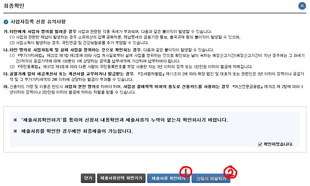 2. 신청/제출 → 사업자등록신청(개인)을 누른다.