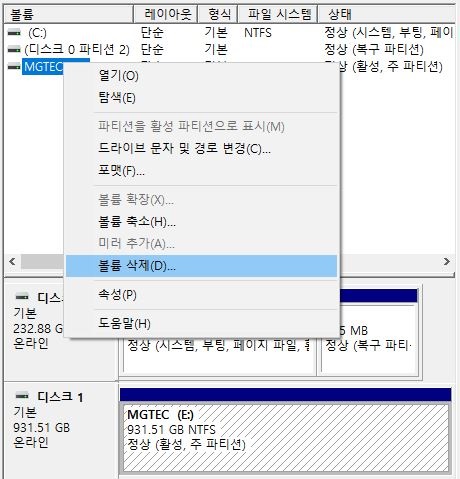 2. 맥과 윈도우 호환할 외장하드를 오른쪽 마우스 클릭하여 볼륨 삭제를 누른다.