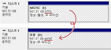 양쪽에서 다 사용하려면 exFAT로 포맷을 해줘야 한다!