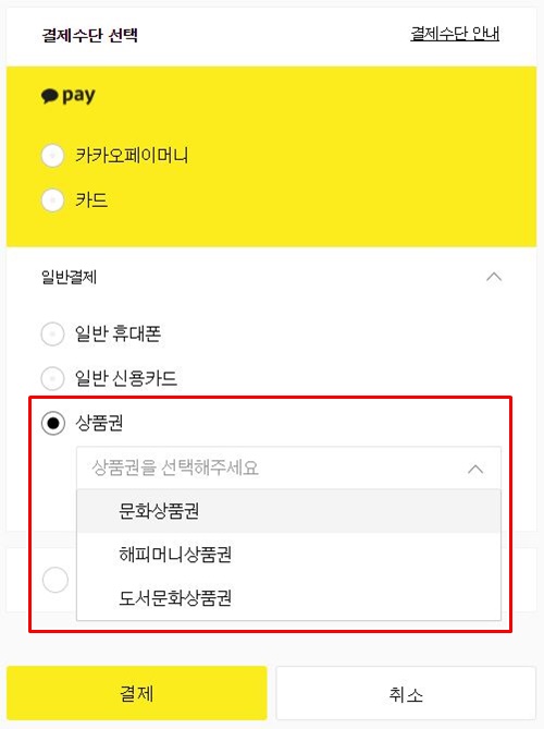 우리는 상품권 - 문화상품권 선택하고 결제 누른다.