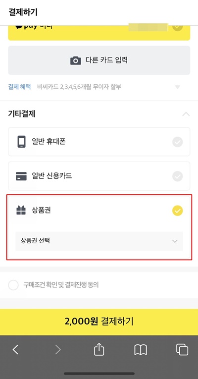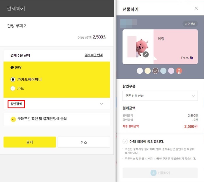 2. 구매하기 또는 선물하기를 누르면 결제수단 선택이 나오는데, 여기서 일반 결제를 눌러야 함
