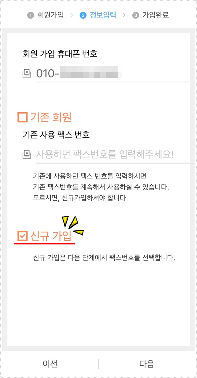 번호 입력하고 신규 가입에 체크한 뒤 넘어가기