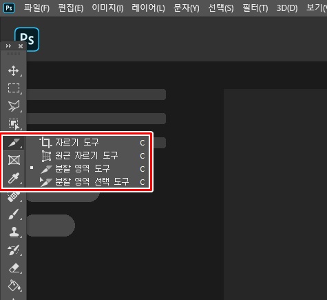 우선 포토샵을 켜고 툴 메뉴에서 분할 영역 도구(Slice tool)를 선택한다.