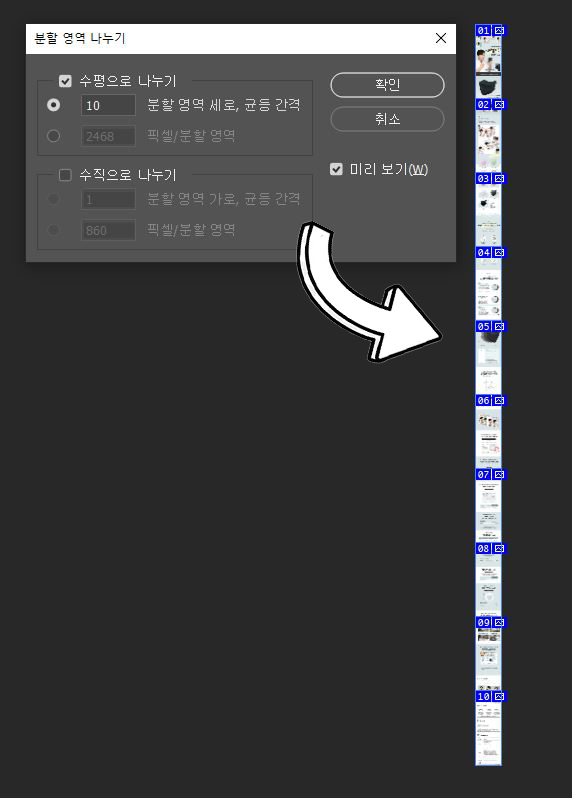 수직으로 똑같이 10으로 나누면 이렇게 됩니다. 미리 보기 할 수 있으니까 걱정 마세요~