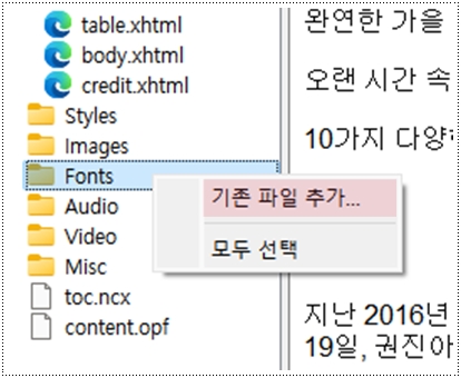 폰트를 가져오는 방법은 Fonts 폴더 오른쪽 마우스 클릭하면 나타나는 '기존 파일 추가' 누르고요,