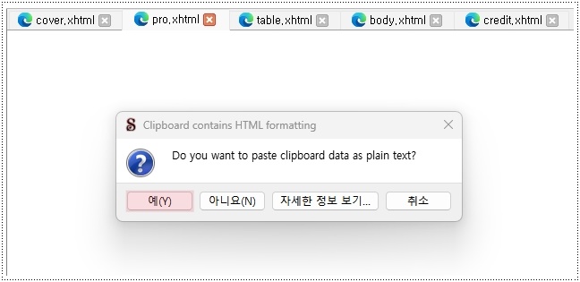 준비된 원고를 Ctrl+A(전체선택) 해서 Ctrl+C(복사) 한뒤, 빈 화면에 Ctrl+V(붙여넣기)하면 이런 창이 뜰 건데요, 예 눌러주면 된답니다.